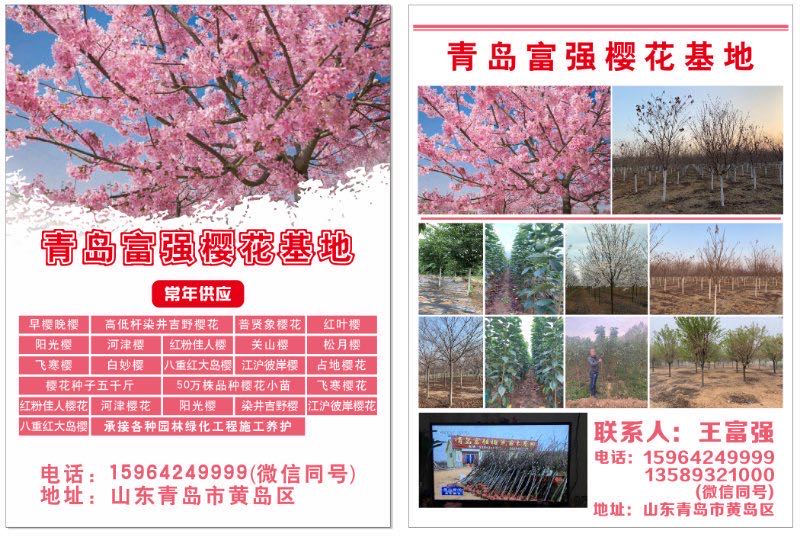 山東青島富強(qiáng)櫻花苗木基地歡迎您(王富強(qiáng) 13780680000、13589321000),青島富強(qiáng)品種櫻花基地常年供應(yīng):早櫻晚櫻,高低桿染井吉野櫻花,陽(yáng)光櫻,河津櫻,紅粉佳人櫻,關(guān)山櫻,大漁櫻,松月櫻,飛寒櫻,白妙櫻,美利堅(jiān)櫻,紅花染井吉野櫻,八重紅大島櫻,江滬彼岸櫻,小松乙女櫻,思川櫻,紅山櫻,雅櫻,獎(jiǎng)?wù)聶,八重紅垂枝櫻等占地櫻花,承接各種園林綠化工程施工養(yǎng)護(hù)。歡迎新老客戶來(lái)我們這邊考察,購(gòu)苗買苗服務(wù)。